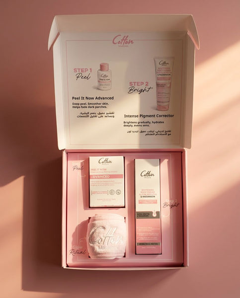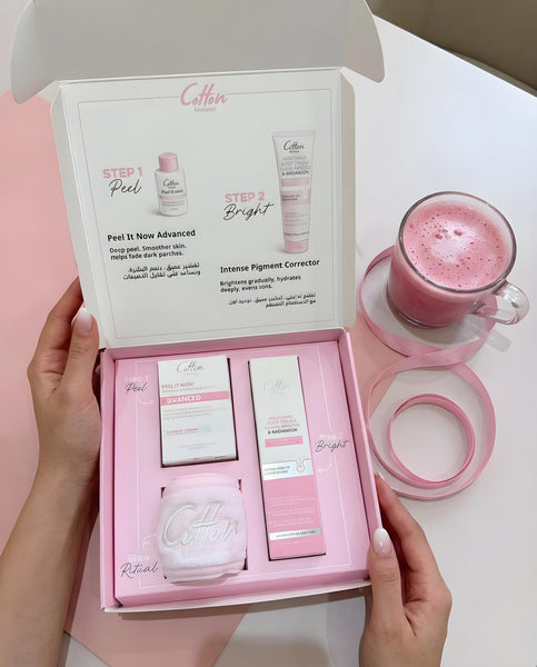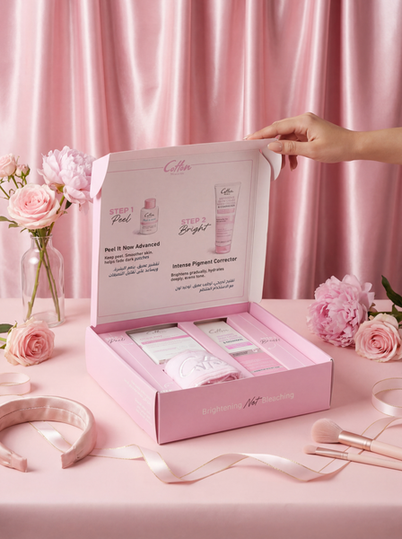 يعمل الروتين على إزالة الطبقة المتصبغة والجلد الميت باستخدام التقشير، ثم يساعد كريم التفتيح على ترطيب البشرة، تفتيح التصبغات، وتوحيد اللون مع الاستخدام المستمر.