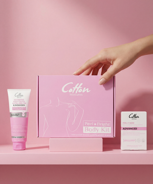 مجموعة متكاملة لتقشير الجسم وتفتيح التصبغات، مصممة لتحسين لون وملمس البشرة من خلال تقشير الجلد أولاً ثم معالجة التصبغات وتوحيد اللون تدريجياً.