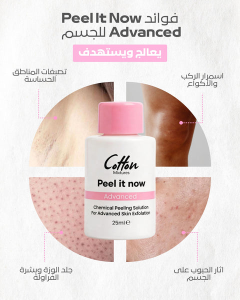 Peel it now Advanced هو محلول تقشير كيميائي مخصص للجسم، يساعد على إزالة الطبقة السطحية من الجلد، تقليل التصبغات، تحسين ملمس البشرة، وتوحيد لون الجلد من خلال تحفيز تجدد الخلايا.